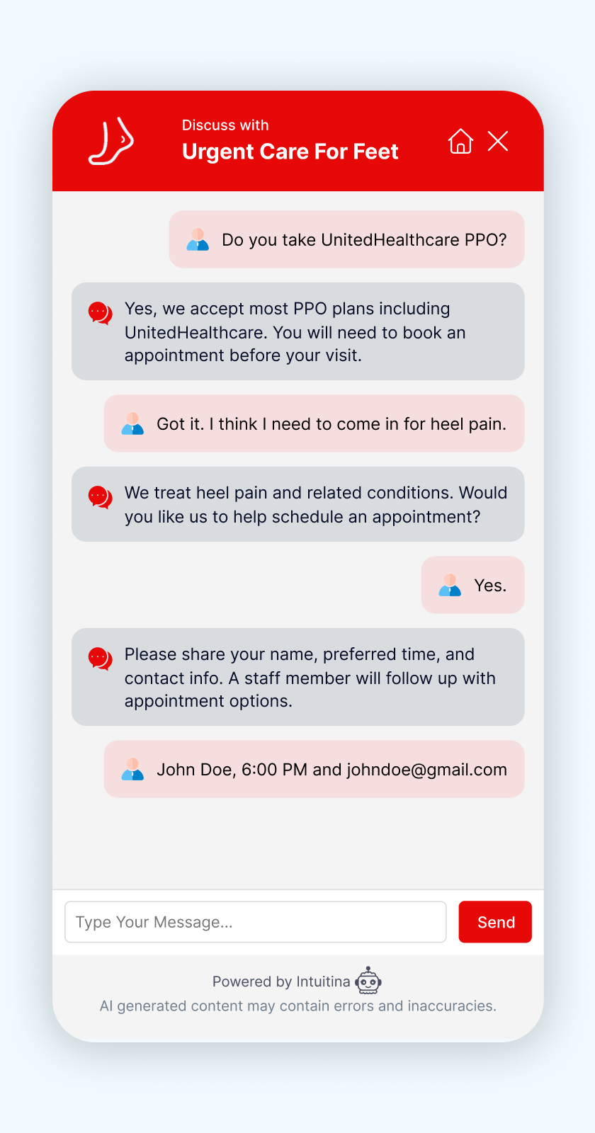 - Collect Leads and Promote Appointments: Intuitina’s chatbot is designed with a pre-chat lead capture feature that prompts visitors for their name and contact info when starting a chat. Urgent Care for Feet leveraged this to capture potential patient details and encourage appointment requests.